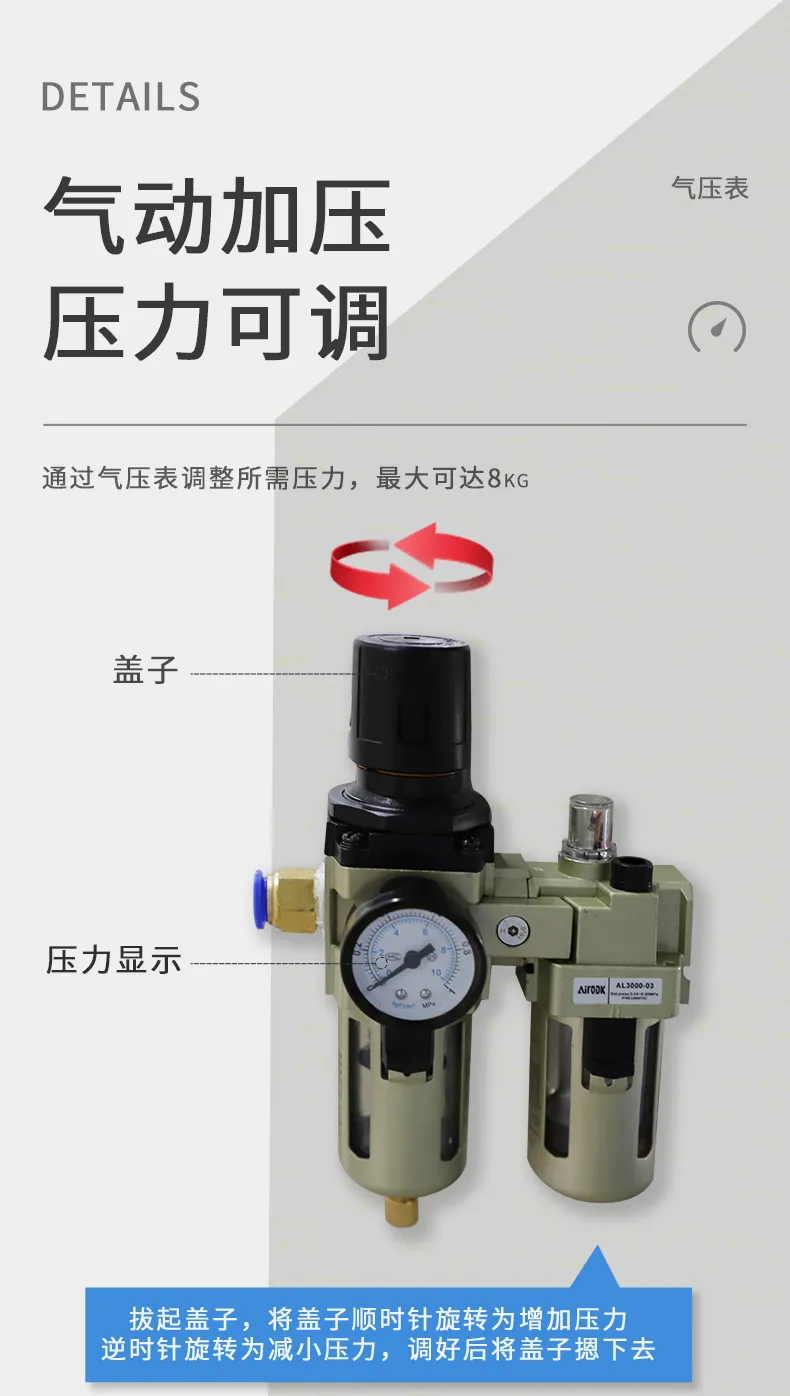 3、氣動加壓,效率高(gāo),壓力大(dà),壓↔≈♦力最大(dà)可(kě)達8kg/cm²。$↔