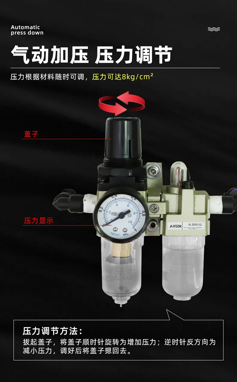 3、氣動加壓,效率高(gāo),壓力大(dà),壓力最大(₽≠dà)可(kě)達8kg/cm²。