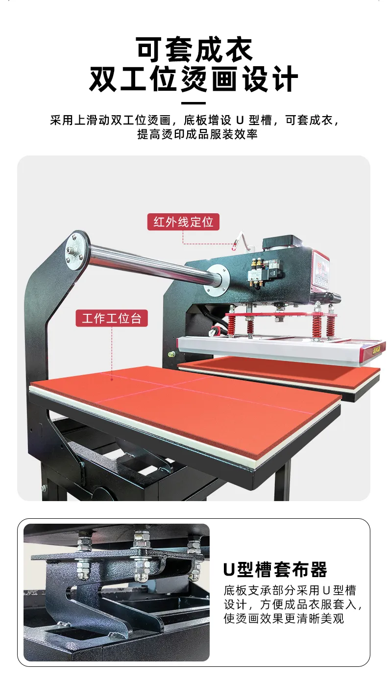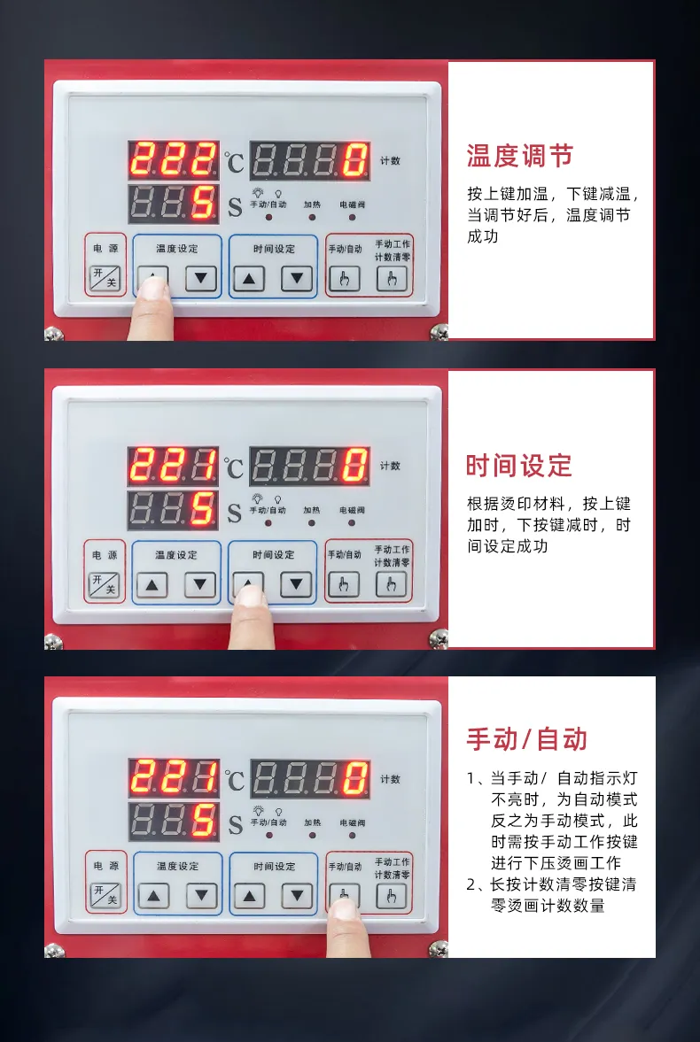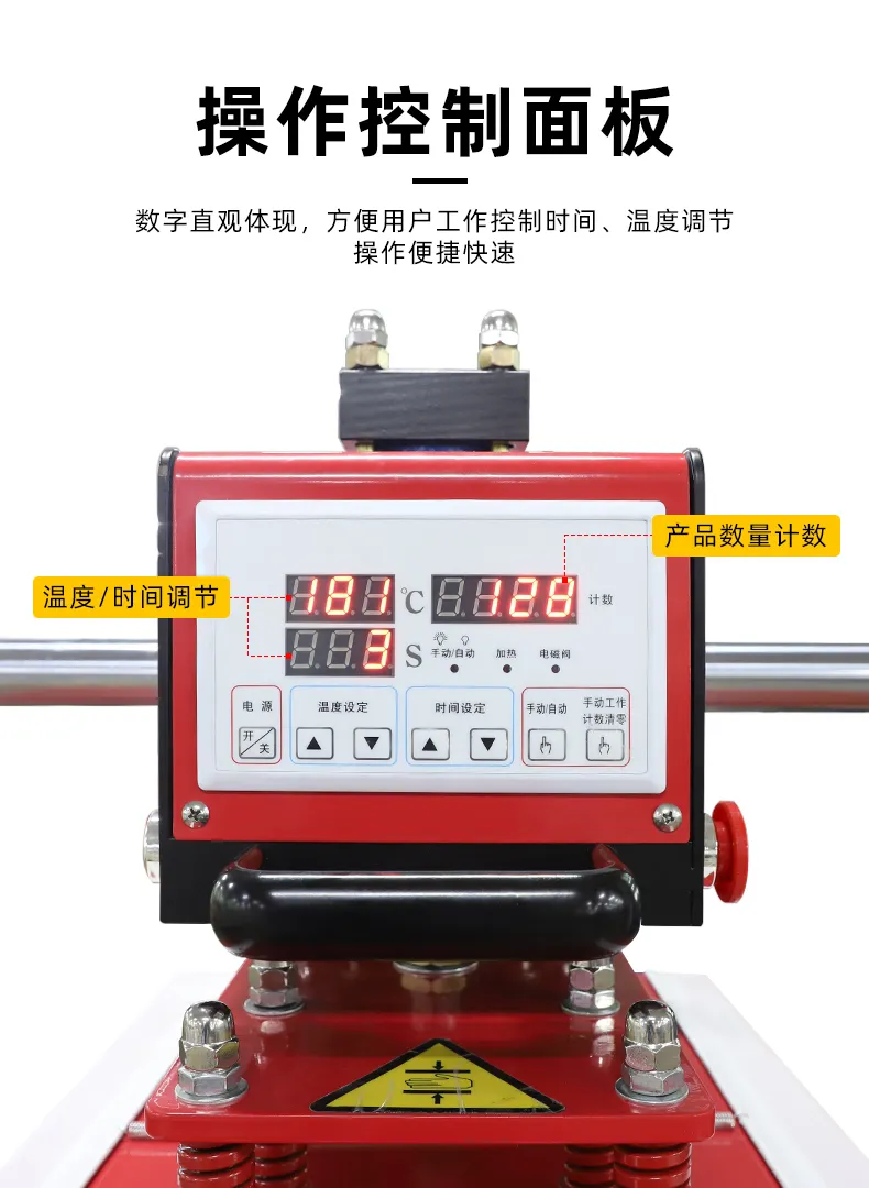 2、溫度、時(shí)間(jiān)數(shù)字直觀顯示,采用(yòng®∑×)氣動壓力燙畫(huà),壓力可(kě)達Ωπ8kg/cm²;