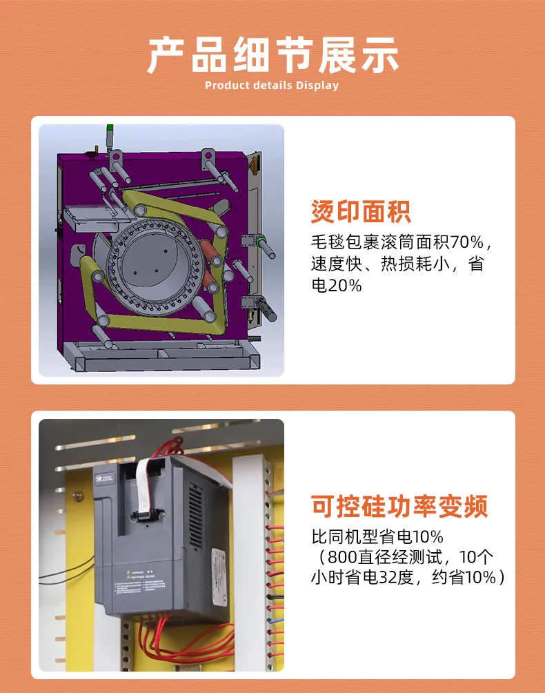 4、毛毯包裹滾筒面積達70%:溫區(qū)長(chán®¥g),速度快(kuài),滾筒熱(rè)損耗小(xiǎo),相(₹₽λ✔xiàng)對(duì)标準版(毛毯50%包裹面積)省電±±≤'(diàn)20%;