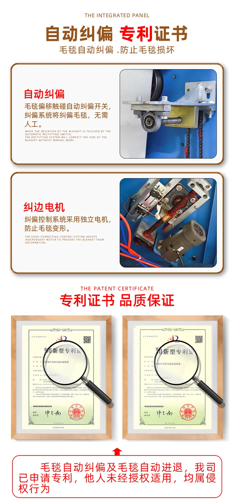 1、毛毯自(zì)動糾偏(我司專利技(jì)術(shù)):智能(nén§→Ωg)防止毛毯跑偏、變形。損壞;