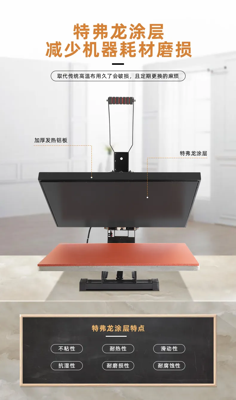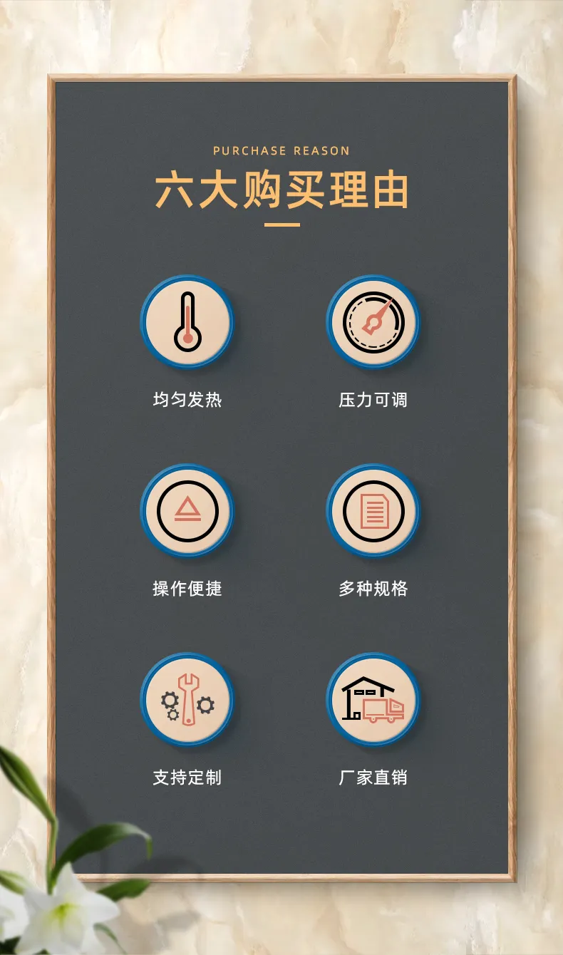 2、發熱(rè)闆表面噴有(yǒu)特氟龍塗層,具有(yǒu):不(bù $☆)粘性、耐熱(rè)性、滑動性、抗濕性、磨損性、耐腐蝕性特性,✘★對(duì)比傳統表面包裹高(gāo)溫布✘ ,更加方便省心,壓力供熱(rè)更加均勻;