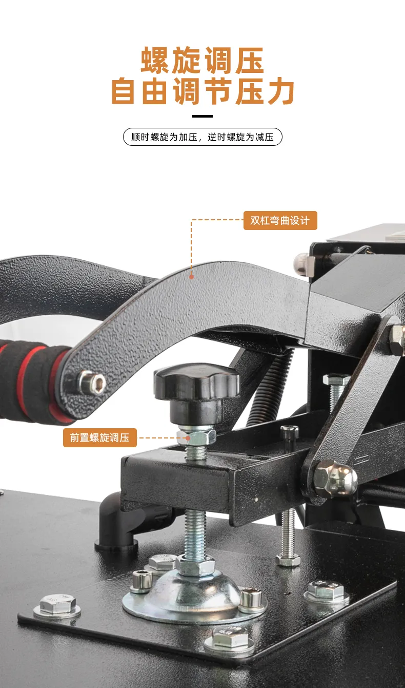 5、采用(yòng)前置螺旋調壓,自(zì)動調節壓力平衡,垂≥ £直下(xià)壓,解決傳統合頁手動機(jī)在壓© γ厚物(wù)時(shí)壓力不(bù)均勻現(xi αàn)象