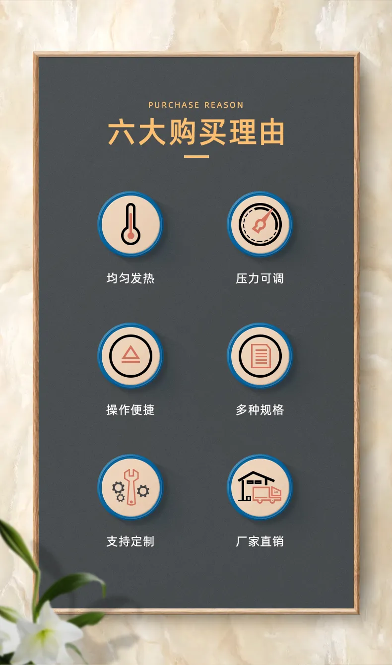 2、發熱(rè)闆表面噴有(yǒu)特氟龍塗層,具有(yǒu):∏<<不(bù)粘性、耐熱(rè)性、滑動性、抗濕性、磨 ₹☆損性、耐腐蝕性特性,對(duì)比傳統表面包裹高(gāo)溫★ β←布,壓力供熱(rè)更加均勻;